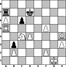 game notation in PGN-format [Event "Wrixum - Open die I."] [Site "www.myChess.de"] [Date "2004.12.11"] [Round "1"] [White "myfairlady"] [Black "Master1"] [ECO "C60"] [WhitemyELO "1868"] [BlackmyELO "1302"] [Result "1-0"] [TimeControl "10/2592000"] [WhiteDays "29"] [BlackDays "30"] [MyChessNo "8699"] 1. e4 e5 2. Nf3 Nc6 3. Bb5 Nge7 4. O-O d6 5. d4 f6 6. c3 a6 7. Ba4 b5 8. Bc2 a5 9. a4 b4 10. Bb3 exd4 11. cxd4 d5 12. exd5 Nxd5 13. Re1+ Be7 14. Qe2 g5 15. Qc4 Bb7 16. Qxd5 Qxd5 17. Bxd5 O-O-O 18. Bxc6 Bxc6 19. Rxe7 Bxf3 20. gxf3 h5 21. Be3 h4 22. Nd2 Rde8 23. Rxe8+ Rxe8 24. Rc1 Kd7 25. Rc5 Ra8 26. Nc4 Rg8 27. h3 f5 28. Rxf5 Ke6 29. Rxa5 c6 30. Re5+ Kf6 31. a5 b3 32. a6 Ra8 33. Bxg5+ Kf7 34. Ra5 Ra7 35. Bxh4 Ke6 36. f4 Kd7 37. f5 1-0 position notation in FEN-format 8/r2k4/P1p5/R4P2/2NP3B/1p5P/1P3P2/6K1 - - - 0 37 Captured white pieces: Captured black pieces: Click on a captured piece in order to display the desired move!