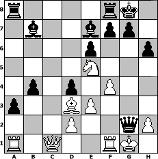 game notation in PGN-format [Event "Carpe Diem 2"] [Site "www.myChess.de"] [Date "2007.08.11"] [Round "2"] [White "bruno"] [Black "ujack1961"] [ECO "D53"] [WhitemyELO "1495"] [BlackmyELO "1781"] [Result "0-1"] [TimeControl "10/1728000"] [WhiteDays "60"] [BlackDays "60"] [MyChessNo "37268"] 1. d4 d5 2. c4 e6 3. Nc3 Nf6 4. Bg5 Be7 5. Nf3 Nbd7 6. e3 O-O 7. Bd3 c6 8. O-O dxc4 9. Bxc4 b5 10. Bd3 h6 11. Bxf6 Nxf6 12. a3 Bb7 13. b4 a5 14. Qb3 Nd5 15. Ne5 axb4 16. Nxd5 Qxd5 17. Qb2 bxa3 18. Qc3 c5 19. f3 b4 20. Qc1 cxd4 21. f4 Qxg2# 0-1 position notation in FEN-format r4rk1/1b2bpp1/4p2p/4N3/1p1p1P2/p2BP3/3P2qP/R1Q2RK1 - - - 0 22 Captured white pieces: ![]() ![]() ![]() ![]() ![]() ![]() ![]() ![]() ![]() ![]() ![]() ![]() ![]() ![]() ![]() Captured black pieces: ![]() ![]() ![]() ![]() ![]() ![]() ![]() ![]() ![]() ![]() ![]() ![]() ![]() ![]() ![]() Click on a captured piece in order to display the desired move!