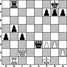 game notation in PGN-format [Event "Aprilwetterturnier"] [Site "www.myChess.de"] [Date "2016.06.04"] [Round "1"] [White "miu"] [Black "Schefsche"] [ECO "A21"] [WhitemyELO "1549"] [BlackmyELO "1428"] [Result "0-1"] [TimeControl "10/864000"] [WhiteDays "46"] [BlackDays "33"] [MyChessNo "103768"] 1. c4 e5 2. Nc3 Bc5 3. Nf3 d6 4. e3 Bg4 5. Be2 Bxf3 6. Bxf3 c6 7. Na4 Nd7 8. O-O Qa5 9. Re1 Ngf6 10. d4 Bb4 11. Re2 e4 12. Bxe4 Nxe4 13. a3 Bc3 14. Nxc3 Nxc3 15. bxc3 Qxc3 16. Bd2 Qxc4 17. Rc1 Qd5 18. Bc3 O-O 19. f3 a5 20. e4 Qe6 21. Rb1 b5 22. Qe1 Qc4 23. Kh1 a4 24. Reb2 Rfe8 25. Bb4 Qxd4 26. Rd2 Qa7 27. Bxd6 Qb6 28. Qe2 Nc5 29. e5 Nb3 30. Rc2 Nd4 31. Qe3 Rad8 32. Bc5 Nxc2 33. Qc3 Qc7 34. Bd6 Rxd6 35. exd6 Qxd6 36. Qxc2 Qe6 37. Kg1 Qe3+ 38. Kf1 Qxa3 39. Rd1 Qe7 40. Qd2 c5 41. g3 c4 42. Rb1 Rb8 43. Qc2 Qe3 0-1 position notation in FEN-format 1r4k1/5ppp/8/1p6/p1p5/4qPP1/2Q4P/1R3K2 - - - 4 44 Captured white pieces: Captured black pieces: Click on a captured piece in order to display the desired move!