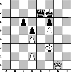 game notation in PGN-format [Event "R"] [Site "www.myChess.de"] [Date "2010.08.26"] [Round "1"] [White "werderfan"] [Black "Naunhofer"] [ECO "?"] [WhitemyELO "1533"] [BlackmyELO "1542"] [Result "1/2-1/2"] [TimeControl "10/864000"] [WhiteDays "49"] [BlackDays "48"] [MyChessNo "67885"] 1. d4 Nf6 2. c4 e6 3. Nc3 d5 4. Bg5 Nbd7 5. e3 c6 6. cxd5 exd5 7. Nf3 Be7 8. Bd3 O-O 9. O-O Ne4 10. Bxe7 Qxe7 11. Qc2 Ndf6 12. Rfe1 Bd7 13. Ne5 Nxc3 14. Nxd7 Qxd7 15. bxc3 Rfe8 16. Rab1 b5 17. h4 Qg4 18. g3 Ne4 19. Bxe4 Rxe4 20. Qe2 Qg6 21. Kg2 Rxh4 22. Rh1 Rxh1 23. Rxh1 Re8 24. Rh4 Re4 25. Rf4 Rxf4 26. exf4 Qe6 27. Qb2 h5 28. Qa3 Qe4+ 29. Kh2 Qf3 30. Qxa7 Qxf2+ 31. Kh3 Qf1+ 32. Kh2 Qc4 33. Qb8+ Kh7 34. Qe5 Qxa2+ 35. Kh3 Qc2 36. Qxh5+ Kg8 37. Qg5 f6 38. Qh5 Qh7 39. Kg4 g6 40. Qh4 Qd7+ 41. Kf3 Kg7 42. g4 Qe7 43. Qf2 b4 44. cxb4 Qxb4 45. Qe3 Kf7 46. f5 gxf5 47. gxf5 Qd6 48. Qg1 Qe7 1/2-1/2 position notation in FEN-format 8/4qk2/2p2p2/3p1P2/3P4/5K2/3P4/6Q1 - - - 3 49 Captured white pieces: Captured black pieces: Click on a captured piece in order to display the desired move!
