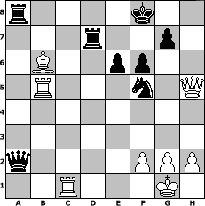 game notation in PGN-format [Event "Ranglistenturnier DWZ 1800 bis 2380 Gr.A"] [Site "www.myChess.de"] [Date "2015.03.09"] [Round "1"] [White "woern63"] [Black "Helangel"] [ECO "B22"] [WhitemyELO "1931"] [BlackmyELO "1951"] [Result "1/2-1/2"] [TimeControl "10/2592000"] [WhiteDays "30"] [BlackDays "08"] [MyChessNo "98460"] 1. e4 c5 2. c3 Nf6 3. e5 Nd5 4. d4 cxd4 5. cxd4 d6 6. Nf3 e6 7. Bc4 Nc6 8. Qe2 Be7 9. O-O O-O 10. Re1 a6 11. Nc3 Nxc3 12. bxc3 dxe5 13. dxe5 Qc7 14. Rb1 b5 15. Bd3 Rd8 16. Ng5 Qxe5 17. Bxh7+ Kf8 18. Qf1 Qc7 19. Be4 Bb7 20. Qe2 Bxg5 21. Bxg5 f6 22. Be3 Ne7 23. Bxb7 Qxb7 24. c4 Qc6 25. cxb5 axb5 26. Rec1 Qd5 27. Rxb5 Qxa2 28. Qg4 Nf5 29. Qh5 Rd7 30. Bb6 1/2-1/2 position notation in FEN-format r4k2/3r2p1/1B2pp2/1R3n1Q/8/8/q4PPP/2R3K1 - - - 5 30 Captured white pieces: Captured black pieces: Click on a captured piece in order to display the desired move!