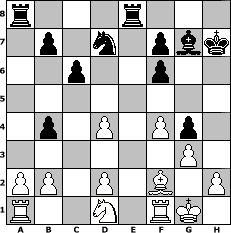 game notation in PGN-format [Event "Windecker Herbst-Open"] [Site "www.myChess.de"] [Date "2014.10.08"] [Round "1"] [White "martinus"] [Black "orion"] [ECO "D80"] [WhitemyELO "1726"] [BlackmyELO "1672"] [Result "1/2-1/2"] [TimeControl "10/1728000"] [WhiteDays "20"] [BlackDays "20"] [MyChessNo "96201"] 1. d4 Nf6 2. c4 g6 3. Nc3 d5 4. g3 dxc4 5. Qa4+ c6 6. Qxc4 Be6 7. Qb4 Qb6 8. Qxb6 axb6 9. Bh3 Bxh3 10. Nxh3 Nbd7 11. O-O b5 12. Ng5 Bg7 13. e4 O-O 14. e5 b4 15. exf6 exf6 16. Nxh7 Rfe8 17. Nd1 Kxh7 18. Be3 g5 19. f4 g4 20. Bf2 1/2-1/2 position notation in FEN-format r3r3/1p1n1pbk/2p2p2/8/1p1P1Pp1/6P1/PP1P1B1P/R2N1RK1 - - - 1 20 Captured white pieces: Captured black pieces: Click on a captured piece in order to display the desired move!