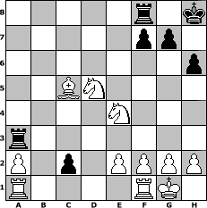 game notation in PGN-format [Event "Albspiele II"] [Site "www.myChess.de"] [Date "2010.01.10"] [Round "1"] [White "alpacino"] [Black "beowulf"] [ECO "C44"] [WhitemyELO "1326"] [BlackmyELO "1339"] [Result "1-0"] [TimeControl "10/2592000"] [WhiteDays "27"] [BlackDays "30"] [MyChessNo "62270"] 1. e4 e5 2. Nf3 Nc6 3. c3 Nf6 4. Bc4 h6 5. d4 d6 6. d5 Na5 7. Qa4+ Bd7 8. Qxa5 Nxe4 9. O-O Be7 10. Nbd2 b6 11. Qa3 O-O 12. Nxe4 c6 13. b3 b5 14. dxc6 Bxc6 15. Bd3 d5 16. Nc5 e4 17. Bxe4 dxe4 18. Nd4 Bd5 19. Be3 Qc7 20. b4 a5 21. Nxb5 Qc6 22. Nd4 axb4 23. Nxc6 Rxa3 24. Nxe7+ Kh8 25. Nxd5 bxc3 26. Nxe4 c2 27. Bc5 1-0 position notation in FEN-format 5r1k/5pp1/7p/2BN4/4N3/r7/P1p1PPPP/R4RK1 - - - 1 27 Captured white pieces: Captured black pieces: Click on a captured piece in order to display the desired move!