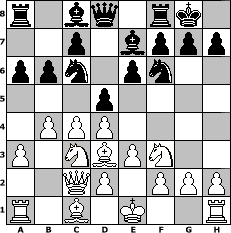 game notation in PGN-format [Event "Aschermittwoch 2014"] [Site "www.myChess.de"] [Date "2014.03.06"] [Round "1"] [White "Koprek"] [Black "Lemmi11"] [ECO "D31"] [WhitemyELO "2065"] [BlackmyELO "1849"] [Result "1-0"] [TimeControl "10/3456000"] [WhiteDays "35"] [BlackDays "00"] [MyChessNo "93337"] 1. d4 d5 2. c4 e6 3. Nc3 Nc6 4. Nf3 Nf6 5. a3 Be7 6. e3 O-O 7. Qc2 a6 8. b4 b6 9. Bd3 1-0 position notation in FEN-format r1bq1rk1/2p1bppp/ppn1pn2/3p4/1PPP4/P1NBPN2/2QP1PPP/R1B1K2R - KQ - 1 9 Captured white pieces: Captured black pieces: Click on a captured piece in order to display the desired move!
