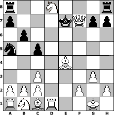 game notation in PGN-format [Event "48/54er Turnier"] [Site "www.myChess.de"] [Date "2010.11.18"] [Round "2"] [White "Achim48"] [Black "Ilona48"] [ECO "A00"] [WhitemyELO "1500"] [BlackmyELO "1422"] [Result "1-0"] [TimeControl "10/2592000"] [WhiteDays "90"] [BlackDays "87"] [MyChessNo "69941"] 1. c3 e5 2. d4 d6 3. d5 b6 4. g3 Nf6 5. Bg2 c5 6. Nf3 Bb7 7. Ng5 Bxd5 8. e4 Nxe4 9. Nxe4 Nc6 10. Qxd5 Ne7 11. Nxd6+ Kd7 12. Bh3+ f5 13. Qxe5 Nc6 14. Bxf5+ Kc7 15. Nb5+ Kb7 16. Qf4 Ka6 17. Qa4+ Na5 18. O-O Bd6 19. Rd1 Kb7 20. Nxd6+ Kc7 21. Qf4 Kc6 22. Be4+ Kd7 23. Nf7+ Ke8 24. Nxd8 Ke7 25. Qf7# 1-0 position notation in FEN-format r2N3r/p3kQpp/1p6/n1p5/4B3/2P3P1/PPP2P1P/RNBR2K1 - - - 2 25 Captured white pieces: Captured black pieces: Click on a captured piece in order to display the desired move!