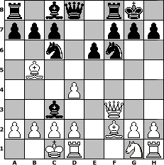 game notation in PGN-format [Event "Carpe Diem"] [Site "www.myChess.de"] [Date "2007.07.31"] [Round "1"] [White "Knight"] [Black "lure"] [ECO "D00"] [WhitemyELO "1239"] [BlackmyELO "1473"] [Result "0-1"] [TimeControl "10/864000"] [WhiteDays "00"] [BlackDays "08"] [MyChessNo "36804"] 1. d4 d5 2. e4 dxe4 3. Nc3 Nf6 4. f3 exf3 5. Qxf3 e6 6. Be3 Bb4 7. Bf2 O-O 8. O-O-O Nc6 9. Bb5 Bxc3 0-1 position notation in FEN-format r1bq1rk1/ppp2ppp/2n1pn2/1B6/3P4/2b2Q2/PPPP1BPP/2KR2NR - - - 0 10 Captured white pieces: Captured black pieces: Click on a captured piece in order to display the desired move!
