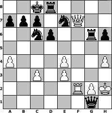 game notation in PGN-format [Event "Wrixum - Open die I."] [Site "www.myChess.de"] [Date "2004.12.11"] [Round "1"] [White "OwainGwynedd"] [Black "rikilatic"] [ECO "A00"] [WhitemyELO "1277"] [BlackmyELO "1563"] [Result "0-1"] [TimeControl "10/2592000"] [WhiteDays "30"] [BlackDays "30"] [MyChessNo "8740"] 1. g3 e5 2. e4 Qf6 3. d3 Bc5 4. Nf3 h6 5. Be2 g5 6. Be3 Bxe3 7. fxe3 d6 8. d4 Bg4 9. h4 Bxf3 10. Bxf3 gxh4 11. gxh4 Nc6 12. dxe5 Qxe5 13. Qd5 Qxb2 14. Bh5 O-O-O 15. O-O Qxa1 16. Qxf7 Nge7 17. c3 Rhg8+ 18. Bg6 Rxg6+ 19. Kh2 Qb2+ 20. Rf2 Qxb1 21. a4 Qg1+ 0-1 position notation in FEN-format 2kr4/ppp1nQ2/2np2rp/8/P3P2P/2P1P3/5RPK/6q1 - - - 1 22 Captured white pieces: Captured black pieces: Click on a captured piece in order to display the desired move!
