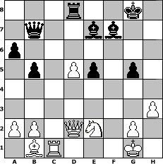 game notation in PGN-format [Event "fr"] [Site "www.myChess.de"] [Date "2011.10.14"] [Round "1"] [White "Fedkopv"] [Black "Erich"] [ECO "C88"] [WhitemyELO "2035"] [BlackmyELO "1963"] [Result "1/2-1/2"] [TimeControl "10/1728000"] [WhiteDays "20"] [BlackDays "20"] [MyChessNo "76801"] 1. e4 e5 2. Nf3 Nc6 3. Bb5 a6 4. Ba4 Nf6 5. O-O Be7 6. Re1 b5 7. Bb3 O-O 8. h3 d6 9. c3 Na5 10. Bc2 c5 11. d4 Qc7 12. Nbd2 exd4 13. cxd4 cxd4 14. Nxd4 Bd7 15. Nf1 Nc6 16. Nxc6 Qxc6 17. Be3 Be6 18. Rc1 Qb7 19. Ng3 Rac8 20. Bd4 Rfd8 21. Qd2 Nd7 22. Nh5 Ne5 23. f4 f6 24. Bb1 Rxc1 25. Rxc1 g6 26. f5 Bf7 27. fxg6 hxg6 28. Nf4 g5 29. Ne2 d5 30. Bxe5 fxe5 31. exd5 1/2-1/2 position notation in FEN-format 3r2k1/1q2bb2/p7/1p1Pp1p1/8/7P/PP1QN1P1/1BR3K1 - - - 0 31 Captured white pieces: Captured black pieces: Click on a captured piece in order to display the desired move!