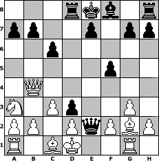 game notation in PGN-format [Event "> 1500"] [Site "www.myChess.de"] [Date "2010.03.18"] [Round "1"] [White "crca108"] [Black "Winston"] [ECO "B01"] [WhitemyELO "1425"] [BlackmyELO "1389"] [Result "0-1"] [TimeControl "10/2592000"] [WhiteDays "60"] [BlackDays "60"] [MyChessNo "64073"] 1. e4 d5 2. e5 d4 3. Nf3 Nc6 4. c3 d3 5. g3 Bg4 6. Na3 Nxe5 7. Qa4+ c6 8. Nxe5 Nf6 9. Nxg4 Nxg4 10. Qxg4 Qd5 11. Rg1 Rd8 12. Bg2 Qe5+ 13. Kd1 f5 14. Qb4 Qe2# 0-1 position notation in FEN-format 3rkb1r/pp2p1pp/2p5/5p2/1Q6/N1Pp2P1/PP1PqPBP/R1BK2R1 - k - 2 15 Captured white pieces: Captured black pieces: Click on a captured piece in order to display the desired move!