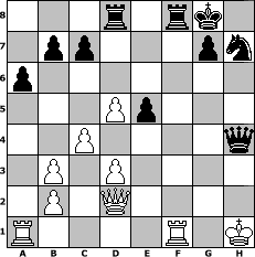 game notation in PGN-format [Event "Auf zum Gegenangriff mit Traxler !"] [Site "www.myChess.de"] [Date "2019.07.03"] [Round "1"] [White "miu"] [Black "sprinterde"] [ECO "C57"] [WhitemyELO "1555"] [BlackmyELO "1761"] [Result "0-1"] [TimeControl "10/1728000"] [WhiteDays "56"] [BlackDays "59"] [MyChessNo "115280"] 1. e4 e5 2. Nf3 Nc6 3. Bc4 Nf6 4. Ng5 Bc5 5. Nc3 O-O 6. d3 h6 7. h4 Na5 8. Bb3 Nxb3 9. axb3 d5 10. exd5 hxg5 11. Bxg5 Bg4 12. f3 Bf5 13. Na4 Be7 14. c4 Nh7 15. Bxe7 Qxe7 16. Nc3 Qc5 17. Qe2 Rae8 18. g4 Bc8 19. Ne4 Qb4+ 20. Nd2 a6 21. O-O Qc5+ 22. Kg2 Qd4 23. Ne4 Rd8 24. Qd2 f5 25. Nf2 fxg4 26. Nxg4 Bxg4 27. fxg4 Qxg4+ 28. Kh1 Qxh4+ 0-1 position notation in FEN-format 3r1rk1/1pp3pn/p7/3Pp3/2P4q/1P1P4/1P1Q4/R4R1K - - - 0 29 Captured white pieces: Captured black pieces: Click on a captured piece in order to display the desired move!