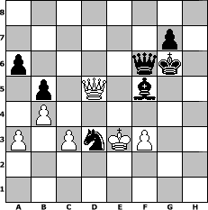 game notation in PGN-format [Event "Advents Special"] [Site "www.myChess.de"] [Date "2016.11.24"] [Round "1"] [White "Achimkogge"] [Black "Caligula"] [ECO "D00"] [WhitemyELO "1437"] [BlackmyELO "1332"] [Result "1-0"] [TimeControl "10/1728000"] [WhiteDays "17"] [BlackDays "00"] [MyChessNo "105779"] 1. d4 d5 2. c3 e6 3. Nf3 Nf6 4. Bf4 c5 5. e3 Nc6 6. Bb5 Bd7 7. dxc5 a6 8. Bd3 Bxc5 9. O-O h6 10. Nbd2 b5 11. h3 Nh5 12. Bh2 O-O 13. Qc2 f5 14. g4 fxg4 15. hxg4 Nf6 16. Kg2 Nxg4 17. Bg3 Nf6 18. Ne5 Ne7 19. b4 Bd6 20. Ng6 Nxg6 21. Bxd6 Nh4+ 22. Kg1 Rf7 23. f3 Bc6 24. Bg3 Nf5 25. Bxf5 exf5 26. Qxf5 Bd7 27. Qg6 Qc8 28. Rac1 Qc6 29. Be5 Re8 30. Bf4 Qc8 31. Bxh6 Nh7 32. Kf2 Bf5 33. Qg3 Qe6 34. Rg1 Qxh6 35. Rce1 Nf6 36. Rh1 Nh5 37. Qg2 Rfe7 38. a3 Rxe3 39. Ne4 Rxe1 40. Rxe1 Nf4 41. Nf6+ Qxf6 42. Rxe8+ Kf7 43. Qg3 Nd3+ 44. Ke3 Kxe8 45. Qb8+ Kf7 46. Qb7+ Kg6 47. Qxd5 1-0 position notation in FEN-format 8/6p1/p4qk1/1p1Q1b2/1P6/P1PnKP2/8/8 - - - 0 47 Captured white pieces: Captured black pieces: Click on a captured piece in order to display the desired move!