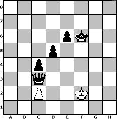 game notation in PGN-format [Event "Ende 2014"] [Site "www.myChess.de"] [Date "2014.12.20"] [Round "1"] [White "Achimkogge"] [Black "Andylein1989"] [ECO "D00"] [WhitemyELO "1462"] [BlackmyELO "1512"] [Result "0-1"] [TimeControl "10/2592000"] [WhiteDays "177"] [BlackDays "134"] [MyChessNo "97180"] 1. d4 d5 2. Bf4 Bf5 3. Nc3 e6 4. Nf3 Bd6 5. e3 Bxf4 6. exf4 Nf6 7. Ne5 O-O 8. h3 h6 9. g4 Bh7 10. h4 Ne4 11. Bd3 Nxc3 12. bxc3 Qf6 13. Bxh7+ Kxh7 14. Qd3+ Kg8 15. Qf3 Rd8 16. O-O-O Nd7 17. Nxd7 Rxd7 18. g5 Qg6 19. h5 Qh7 20. g6 fxg6 21. Qd3 gxh5 22. Qxh7+ Kxh7 23. Rxh5 Rf8 24. Rh4 Rf5 25. Rg1 Rdf7 26. f3 Rxf4 27. Rxf4 Rxf4 28. Rg3 g5 29. Kd2 Kg6 30. Ke3 h5 31. Rh3 b6 32. a4 c5 33. dxc5 bxc5 34. a5 Ra4 35. Rh1 Rxa5 36. Rg1 Ra4 37. Rb1 Rc4 38. Kd3 a5 39. Rb6 Kf5 40. Rb8 h4 41. Rf8+ Ke5 42. Rg8 Kf6 43. Rf8+ Kg7 44. Re8 Kf7 45. Ra8 a4 46. Ra7+ Kf6 47. Rb7 g4 48. fxg4 Rxg4 49. Rb5 c4+ 50. Ke3 h3 51. Rb1 a3 52. Kf2 h2 53. Rh1 a2 54. Ra1 Rg1 55. Rxg1 hxg1=Q+ 56. Kxg1 a1=Q+ 57. Kf2 Qxc3 0-1 position notation in FEN-format 8/8/4pk2/3p4/2p5/2q5/2P2K2/8 - - - 0 58 Captured white pieces: Captured black pieces: Click on a captured piece in order to display the desired move!