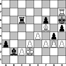game notation in PGN-format [Event "In Memorium Michael Knopf"] [Site "www.myChess.de"] [Date "2012.04.10"] [Round "1"] [White "Wernburger"] [Black "faustballer"] [ECO "A34"] [WhitemyELO "1508"] [BlackmyELO "1513"] [Result "1-0"] [TimeControl "10/2592000"] [WhiteDays "142"] [BlackDays "150"] [MyChessNo "81117"] 1. c4 c5 2. Nc3 e5 3. g3 a6 4. Bg2 Nf6 5. d3 h6 6. a3 Ra7 7. Be3 d6 8. Nf3 Bd7 9. O-O Be7 10. b4 b6 11. Qb3 O-O 12. Bd2 b5 13. cxb5 axb5 14. bxc5 dxc5 15. Nxe5 b4 16. axb4 Rxa1 17. Rxa1 Be6 18. Nc4 cxb4 19. Ne4 Nxe4 20. Bxe4 Qd4 21. Rc1 Bxc4 22. Rxc4 Qa1+ 23. Rc1 Qa3 24. Qxa3 bxa3 25. Rc7 Bf6 26. Bc3 Na6 27. Rc6 Bxc3 28. Rxa6 Bb2 29. Kf1 Rc8 30. Ke1 f6 31. Bd5+ Kh7 32. Be4+ Kg8 33. Bd5+ Kh7 34. Bc4 h5 35. h3 g6 36. f3 Kh6 37. Kd2 Kg7 38. e4 g5 39. Ra7+ Kh6 40. Be6 Rc6 41. Bf5 g4 42. Rh7+ 1-0 position notation in FEN-format 8/7R/2r2p1k/5B1p/4P1p1/p2P1PPP/1bPK4/8 - - - 1 42 Captured white pieces: ![]() ![]() ![]() ![]() ![]() ![]() ![]() ![]() ![]() ![]() ![]() ![]() ![]() ![]() ![]() Captured black pieces: ![]() ![]() ![]() ![]() ![]() ![]() ![]() ![]() ![]() ![]() ![]() ![]() ![]() ![]() ![]() Click on a captured piece in order to display the desired move!