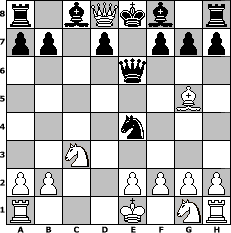 game notation in PGN-format [Event "Urlaubsendspiel"] [Site "www.myChess.de"] [Date "2011.08.30"] [Round "1"] [White "martinus"] [Black "Greenhorn"] [ECO "C21"] [WhitemyELO "1732"] [BlackmyELO "1509"] [Result "1-0"] [TimeControl "10/1728000"] [WhiteDays "20"] [BlackDays "20"] [MyChessNo "75811"] 1. e4 e5 2. d4 exd4 3. c3 dxc3 4. Nxc3 Nc6 5. Bc4 Nf6 6. Qb3 Qe7 7. Bg5 Na5 8. Qa4 Nxc4 9. Qxc4 Qe6 10. Qxc7 Nxe4 11. Qd8# 1-0 position notation in FEN-format r1bQkb1r/pp1p1ppp/4q3/6B1/4n3/2N5/PP2PPPP/R3K1NR - KQkq - 1 11 Captured white pieces: Captured black pieces: Click on a captured piece in order to display the desired move!