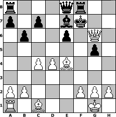 game notation in PGN-format [Event "Weihnachtsturnier 2012"] [Site "www.myChess.de"] [Date "2012.12.18"] [Round "1"] [White "Grubengeist"] [Black "reisender"] [ECO "B00"] [WhitemyELO "1956"] [BlackmyELO "1409"] [Result "1-0"] [TimeControl "10/864000"] [WhiteDays "10"] [BlackDays "10"] [MyChessNo "85555"] 1. e4 b6 2. d4 Bb7 3. Nc3 e6 4. Nf3 Be7 5. Be2 d5 6. exd5 Bxd5 7. Nxd5 Qxd5 8. Ne5 Nf6 9. Bf3 Ne4 10. O-O O-O 11. c4 Qb7 12. Re1 f5 13. Qd3 Nc6 14. Nxc6 Qxc6 15. Rxe4 fxe4 16. Bxe4 Qe8 17. Bxh7+ Kh8 18. Qh3 g5 19. Be4+ Kg7 20. Qh7+ Kf6 21. Qh6+ Kf7 22. Qg6# 1-0 position notation in FEN-format r3qr2/p1p1bk2/1p2p1Q1/6p1/2PPB3/8/PP3PPP/R1B3K1 - - - 7 22 Captured white pieces: Captured black pieces: Click on a captured piece in order to display the desired move!