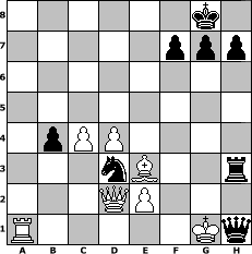 game notation in PGN-format [Event "Winter 2018"] [Site "www.myChess.de"] [Date "2018.01.10"] [Round "1"] [White "Joschi"] [Black "HenrySchinasky"] [ECO "B02"] [WhitemyELO "1565"] [BlackmyELO "2126"] [Result "0-1"] [TimeControl "10/2592000"] [WhiteDays "120"] [BlackDays "117"] [MyChessNo "110971"] 1. e4 Nf6 2. e5 Nd5 3. c4 Nb6 4. d4 d6 5. exd6 exd6 6. Be3 Be7 7. Nc3 O-O 8. Nf3 Re8 9. Bd3 d5 10. c5 Nc4 11. Bxc4 dxc4 12. O-O Be6 13. h3 c6 14. Qc2 Na6 15. a3 Nc7 16. Ne4 Qd5 17. Ned2 b5 18. cxb6 axb6 19. a4 b5 20. axb5 cxb5 21. Rfc1 Na6 22. Nf1 Nb4 23. Qd2 Bxh3 24. gxh3 Qxf3 25. Ng3 Nd3 26. Rcb1 Rxa1 27. Rxa1 b4 28. b3 Bd6 29. Nf1 Re6 30. bxc4 Rg6+ 31. Ng3 Bxg3 32. fxg3 Rxg3+ 33. Kh2 Rxh3+ 34. Kg1 Qh1# 0-1 position notation in FEN-format 6k1/5ppp/8/8/1pPP4/3nB2r/3QP3/R5Kq - - - 2 35 Captured white pieces: Captured black pieces: Click on a captured piece in order to display the desired move!