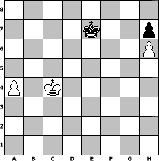game notation in PGN-format [Event "Die Weinlese 2014 m. 50.00 Eu 1.Preis"] [Site "www.myChess.de"] [Date "2014.09.15"] [Round "1"] [White "Helangel"] [Black "HenrySchinasky"] [ECO "B22"] [WhitemyELO "1905"] [BlackmyELO "2115"] [Result "1-0"] [TimeControl "10/2592000"] [WhiteDays "30"] [BlackDays "23"] [MyChessNo "95935"] 1. e4 c5 2. c3 e6 3. d4 d5 4. e5 Nc6 5. Nf3 Qb6 6. a3 Nh6 7. b4 cxd4 8. Bxh6 gxh6 9. cxd4 Bd7 10. Be2 Rg8 11. O-O Rg4 12. h3 Rf4 13. g3 Rxf3 14. Bxf3 Qxd4 15. Qxd4 Nxd4 16. Bh5 a5 17. Nc3 Rc8 18. Ne2 Nc6 19. Rfc1 Nxe5 20. Rxc8+ Bxc8 21. bxa5 Nc4 22. Nf4 Bd6 23. Re1 Bxf4 24. gxf4 Bd7 25. f5 Ke7 26. f4 Nxa5 27. Kf2 Kf6 28. fxe6 fxe6 29. Rg1 Nc4 30. Rg8 Nd6 31. Rh8 Kg7 32. Rd8 Ne4+ 33. Ke3 Nf6 34. Kd4 Bc6 35. Bg4 Kf7 36. Rd6 h5 37. Bxe6+ Ke7 38. Ke5 Ne4 39. Rxd5 Bxd5 40. Bxd5 Nc5 41. h4 Nd3+ 42. Ke4 Nc5+ 43. Kf5 Kf8 44. Bf3 b6 45. Bxh5 Ke7 46. Be2 Ne6 47. Ke5 Nc5 48. f5 Kf7 49. Bc4+ Ke7 50. f6+ Kf8 51. Kd6 Ne4+ 52. Kc6 Nxf6 53. Kxb6 Nd7+ 54. Kc6 Ne5+ 55. Kd5 Nf3 56. h5 Ke7 57. a4 Nd2 58. h6 Nxc4 59. Kxc4 1-0 position notation in FEN-format 8/4k2p/7P/8/P1K5/8/8/8 - - - 0 59 Captured white pieces: Captured black pieces: Click on a captured piece in order to display the desired move!