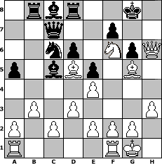game notation in PGN-format [Event "XII. Klub-Meisterschaft -Die Wikinger-"] [Site "www.myChess.de"] [Date "2016.05.01"] [Round "2"] [White "MiFie"] [Black "Hobbykegler"] [ECO "C50"] [WhitemyELO "1055"] [BlackmyELO "1003"] [Result "1-0"] [TimeControl "10/2592000"] [WhiteDays "24"] [BlackDays "20"] [MyChessNo "103511"] 1. e4 e5 2. Nf3 Nc6 3. Bc4 a6 4. d3 Bc5 5. O-O Nh6 6. Ng5 O-O 7. Qh5 Qe7 8. h3 d6 9. Nc3 b5 10. Bd5 Bd7 11. b3 a5 12. Nxb5 g6 13. Qxh6 Rab8 14. Nxc7 Bc8 15. Nxh7 Rd8 16. Bg5 Qxc7 17. Nf6# 1-0 position notation in FEN-format 1rbr2k1/2q2p2/2np1NpQ/p1bBp1B1/4P3/1P1P3P/P1P1PPP1/R4RK1 - - - 1 17 Captured white pieces: Captured black pieces: Click on a captured piece in order to display the desired move!