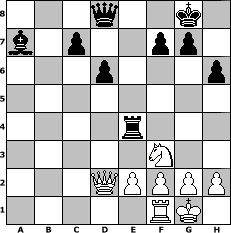 game notation in PGN-format [Event "Fr"] [Site "www.myChess.de"] [Date "2012.03.14"] [Round "1"] [White "Svetlana"] [Black "ClaudiaN"] [ECO "C47"] [WhitemyELO "1767"] [BlackmyELO "1843"] [Result "0-1"] [TimeControl "10/2592000"] [WhiteDays "30"] [BlackDays "30"] [MyChessNo "80634"] 1. e4 e5 2. Nf3 Nc6 3. Nc3 Nf6 4. Bc4 Bc5 5. d4 exd4 6. Nd5 h6 7. Bd2 Nxe4 8. O-O O-O 9. b3 d6 10. b4 Be6 11. Bb3 Nxd2 12. Qxd2 Bxd5 13. Bxd5 Nxb4 14. Bxb7 Rb8 15. Be4 Re8 16. a3 Rxe4 17. axb4 Rxb4 18. Rxa7 d3 19. cxd3 Bxa7 20. dxe4 Rxe4 0-1 position notation in FEN-format 3q2k1/b1p2pp1/3p3p/8/4r3/5N2/3QPPPP/5RK1 - - - 0 21 Captured white pieces: ![]() ![]() ![]() ![]() ![]() ![]() ![]() ![]() ![]() ![]() ![]() ![]() ![]() ![]() ![]() Captured black pieces: ![]() ![]() ![]() ![]() ![]() ![]() ![]() ![]() ![]() ![]() ![]() ![]() ![]() ![]() ![]() Click on a captured piece in order to display the desired move!