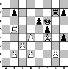 game notation in PGN-format [Event "4. Windeck Open"] [Site "www.myChess.de"] [Date "2011.06.29"] [Round "1"] [White "espero"] [Black "Tomino"] [ECO "A45"] [WhitemyELO "1627"] [BlackmyELO "1755"] [Result "1/2-1/2"] [TimeControl "10/864000"] [WhiteDays "34"] [BlackDays "21"] [MyChessNo "74801"] 1. d4 Nf6 2. Bg5 Ne4 3. Bf4 d5 4. f3 Nf6 5. e4 dxe4 6. Nc3 exf3 7. Nxf3 Nd5 8. Nxd5 Qxd5 9. Bxc7 Nc6 10. c3 Bf5 11. Bd3 e6 12. Bxf5 Qxf5 13. O-O Qd5 14. Qb3 Qxb3 15. axb3 Rc8 16. Bg3 Be7 17. Ne5 Nxe5 18. Bxe5 f6 19. Bg3 a6 20. Rfe1 Kf7 21. Re2 Rhe8 22. Rae1 Bf8 23. b4 g6 24. Rf1 Bg7 25. Bh4 f5 26. Rfe1 Rc7 27. Bg3 Rd7 28. Be5 Bxe5 29. Rxe5 Rd5 30. Kf2 g5 31. h4 Rxe5 32. Rxe5 gxh4 33. b5 axb5 34. Rxb5 Re7 35. Kf3 Kf6 36. Kf4 Rg7 1/2-1/2 position notation in FEN-format 8/1p4rp/4pk2/1R3p2/3P1K1p/2P5/1P1P2P1/8 - - - 5 37 Captured white pieces: Captured black pieces: Click on a captured piece in order to display the desired move!
