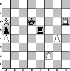 game notation in PGN-format [Event "unter uns Nr. 17"] [Site "www.myChess.de"] [Date "2014.02.13"] [Round "1"] [White "borsti"] [Black "Knight"] [ECO "A02"] [WhitemyELO "1263"] [BlackmyELO "1233"] [Result "1-0"] [TimeControl "10/864000"] [WhiteDays "50"] [BlackDays "49"] [MyChessNo "92929"] 1. f4 e5 2. fxe5 d6 3. d4 dxe5 4. e4 exd4 5. Nf3 Nc6 6. Bb5 Nf6 7. Bg5 Bb4+ 8. Nbd2 Bg4 9. O-O h6 10. Bxf6 Qxf6 11. e5 Qg6 12. Kh1 O-O-O 13. Bxc6 Qxc6 14. a3 Bxd2 15. Qxd2 Bxf3 16. Rxf3 Qd7 17. Rd1 Qe6 18. Qe2 Rhe8 19. Re1 g5 20. Rf6 Qd5 21. Rxh6 d3 22. cxd3 Qxd3 23. Qxd3 Rxd3 24. Rf6 Red8 25. Rxf7 Rd1 26. Rff1 Rxe1 27. Rxe1 Re8 28. g4 Re6 29. Kg2 c5 30. Kf3 b5 31. Ke4 Kd7 32. Kd5 c4 33. Kc5 a6 34. Kd5 a5 35. Kc5 Rc6+ 36. Kxb5 c3 37. Rd1+ Kc7 38. bxc3 Rxc3 39. a4 Rc2 40. h4 gxh4 41. e6 Re2 42. Rh1 Rxe6 43. Rxh4 Re5+ 44. Ka6 Kd6 45. Rh6+ 1-0 position notation in FEN-format 8/8/K2k3R/p3r3/P5P1/8/5P2/8 - - - 4 45 Captured white pieces: Captured black pieces: Click on a captured piece in order to display the desired move!