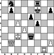 game notation in PGN-format [Event "unter uns Nr. 14"] [Site "www.myChess.de"] [Date "2013.12.02"] [Round "1"] [White "Wulfen49"] [Black "Achimkogge"] [ECO "B01"] [WhitemyELO "1351"] [BlackmyELO "1409"] [Result "0-1"] [TimeControl "10/864000"] [WhiteDays "59"] [BlackDays "49"] [MyChessNo "91553"] 1. e4 d5 2. exd5 Qxd5 3. Nc3 Qe6+ 4. Be2 c6 5. Nf3 Qg4 6. O-O f6 7. Ne5 Qd4 8. Nf3 Qd8 9. d4 Bg4 10. Nh4 Be6 11. Re1 Bf7 12. Nf3 e6 13. b3 Bb4 14. Bd2 Ba3 15. Bc1 Bb4 16. Bd2 a5 17. a3 Bd6 18. Ne4 Bc7 19. b4 Bb6 20. Be3 axb4 21. axb4 Rxa1 22. Qxa1 Ne7 23. c3 O-O 24. Qa8 Qc7 25. c4 Qc8 26. c5 Bc7 27. Qa1 Nd5 28. Nd6 Bxd6 29. Bd2 Bf4 30. Bxf4 Nxf4 31. Bc4 Bh5 32. Nh4 Bf7 33. Qc1 g5 34. Nf3 Kg7 35. b5 cxb5 36. Bxb5 Be8 37. g3 Bxb5 38. gxf4 g4 39. Qb1 Bc6 40. Nh4 f5 41. f3 gxf3 42. Kf2 Qd8 43. Rg1+ Kf6 44. Qb2 Kf7 45. Nxf3 Bxf3 46. Kxf3 Qd5+ 47. Ke3 Qe4+ 48. Kd2 Qxf4+ 49. Kc3 Qe3+ 0-1 position notation in FEN-format 1n3r2/1p3k1p/4p3/2P2p2/3P4/2K1q3/1Q5P/6R1 - - - 2 50 Captured white pieces: Captured black pieces: Click on a captured piece in order to display the desired move!