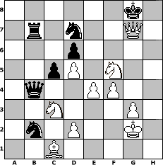 game notation in PGN-format [Event "Entdeckung der Langsamkeit III"] [Site "www.myChess.de"] [Date "2013.03.15"] [Round "1"] [White "Teresa"] [Black "Joschi"] [ECO "A58"] [WhitemyELO "1531"] [BlackmyELO "1600"] [Result "1-0"] [TimeControl "10/3456000"] [WhiteDays "157"] [BlackDays "159"] [MyChessNo "87113"] 1. d4 Nf6 2. c4 c5 3. d5 b5 4. cxb5 a6 5. bxa6 Bxa6 6. Nf3 d6 7. h4 g6 8. e4 Bxf1 9. Kxf1 Bg7 10. Nc3 Nbd7 11. g3 Qa5 12. Qe2 O-O 13. a4 Rfb8 14. Ra3 Rb4 15. Kg2 Ng4 16. Nb5 Rxa4 17. Rxa4 Qxa4 18. h5 h6 19. hxg6 fxg6 20. Nc7 Ra7 21. Nh4 Nge5 22. Nb5 Rb7 23. Nc3 Qb4 24. f4 Nc4 25. Nxg6 Nxb2 26. Nxe7+ Kf7 27. Nf5 Bf8 28. Qh5+ Kg8 29. Qg6+ Kh8 30. Rxh6+ Bxh6 31. Qxh6+ Kg8 32. Qg7# 1-0 position notation in FEN-format 6k1/1r1n2Q1/3p4/2pP1N2/1q2PP2/2N3P1/1n1P2K1/2B5 - - - 2 32 Captured white pieces: Captured black pieces: Click on a captured piece in order to display the desired move!