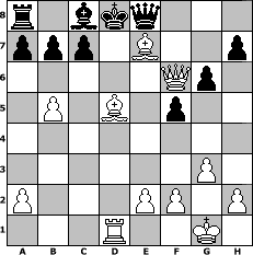 game notation in PGN-format [Event "Internetmeisterschaft Sfr. Heimersheim 2008"] [Site "www.myChess.de"] [Date "2008.03.05"] [Round "1"] [White "MisterBean"] [Black "paula"] [ECO "A51"] [WhitemyELO "1829"] [BlackmyELO "1718"] [Result "1-0"] [TimeControl "10/2592000"] [WhiteDays "67"] [BlackDays "60"] [MyChessNo "43125"] 1. d4 Nf6 2. c4 e5 3. dxe5 Ne4 4. Nd2 Nc5 5. Ngf3 Nc6 6. g3 Qe7 7. Bg2 Nxe5 8. O-O d6 9. b4 Nxf3+ 10. Nxf3 Ne6 11. Bb2 f6 12. Nd4 Nxd4 13. Bxd4 g6 14. b5 Bg7 15. Bd5 Qd7 16. Qd3 Kd8 17. Qc3 Rf8 18. c5 dxc5 19. Bxc5 f5 20. Qa3 Bxa1 21. Bxf8 Be5 22. Rd1 Bd6 23. Qc3 Qe8 24. Qf6+ Be7 25. Bxe7+ 1-0 position notation in FEN-format r1bkq3/ppp1B2p/5Qp1/1P1B1p2/8/6P1/P3PP1P/3R2K1 - - - 0 25 Captured white pieces: ![]() ![]() ![]() ![]() ![]() ![]() ![]() ![]() ![]() ![]() ![]() ![]() ![]() ![]() ![]() Captured black pieces: ![]() ![]() ![]() ![]() ![]() ![]() ![]() ![]() ![]() ![]() ![]() ![]() ![]() ![]() ![]() Click on a captured piece in order to display the desired move!