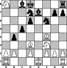 game notation in PGN-format [Event "Einer wird gewinnen !!!"] [Site "www.myChess.de"] [Date "2017.09.28"] [Round "1"] [White "kalle"] [Black "Joschi"] [ECO "A57"] [WhitemyELO "1636"] [BlackmyELO "1581"] [Result "1-0"] [TimeControl "10/1728000"] [WhiteDays "19"] [BlackDays "20"] [MyChessNo "109754"] 1. d4 Nf6 2. c4 c5 3. d5 b5 4. cxb5 a6 5. Nc3 d6 6. e4 axb5 7. Bf4 b4 8. Nb5 Nbd7 9. Nf3 Nxe4 10. Bd3 Nef6 11. Qe2 e5 12. dxe6 fxe6 13. Qxe6+ Qe7 14. Nc7+ Kd8 15. Qxe7+ Bxe7 16. Nxa8 1-0 position notation in FEN-format N1bk3r/3nb1pp/3p1n2/2p5/1p3B2/3B1N2/PP1P1PPP/R3K2R - KQ - 0 16 Captured white pieces: Captured black pieces: Click on a captured piece in order to display the desired move!