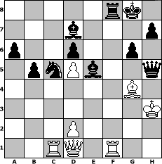 game notation in PGN-format [Event "Mal verliert man, mal gewinnen die anderen"] [Site "www.myChess.de"] [Date "2010.04.17"] [Round "1"] [White "reisinger"] [Black "Lemmi11"] [ECO "E20"] [WhitemyELO "1481"] [BlackmyELO "1734"] [Result "0-1"] [TimeControl "10/864000"] [WhiteDays "40"] [BlackDays "38"] [MyChessNo "64876"] 1. d4 Nf6 2. c4 e6 3. Nc3 c5 4. d5 exd5 5. cxd5 d6 6. Bf4 g6 7. e4 a6 8. Nf3 b5 9. a3 Be7 10. Bh6 Nbd7 11. b4 Ng4 12. Bf4 Qb6 13. h3 cxb4 14. hxg4 bxc3 15. Qc2 Bf6 16. g5 Bg7 17. Be3 Nc5 18. Be2 O-O 19. Nd4 Bd7 20. Qxc3 Nxe4 21. Qd3 Qa5+ 22. Kf1 Rfe8 23. Bf3 Nc5 24. Qd1 Qc3 25. Rc1 Qxa3 26. g3 Rxe3 27. fxe3 Qxe3 28. Nc6 Qxg5 29. Nd4 Bxd4 30. Kg2 Be5 31. g4 f5 32. Kh3 fxg4+ 33. Bxg4 Rf8 34. Rf1 Qh5+ 0-1 position notation in FEN-format 5rk1/3b3p/p2p2p1/1pnPb2q/6B1/7K/3P4/2RQ1R2 - - - 3 35 Captured white pieces: Captured black pieces: Click on a captured piece in order to display the desired move!