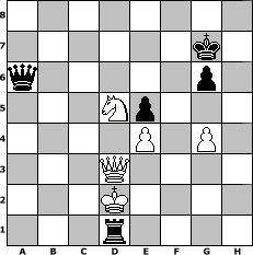 game notation in PGN-format [Event "Mal wieder spielen 2"] [Site "www.myChess.de"] [Date "2013.05.12"] [Round "1"] [White "Steffi"] [Black "Seneca"] [ECO "B07"] [WhitemyELO "1534"] [BlackmyELO "1570"] [Result "0-1"] [TimeControl "10/1728000"] [WhiteDays "034"] [BlackDays "100"] [MyChessNo "88277"] 1. e4 d6 2. d3 e5 3. Nc3 Nf6 4. Bg5 Be7 5. Nf3 Bg4 6. h3 Bh5 7. Be2 h6 8. Bxf6 Bxf6 9. Nd5 c6 10. Nxf6+ Qxf6 11. O-O O-O 12. c3 Nd7 13. Nh2 Bxe2 14. Qxe2 b5 15. b4 a5 16. Ng4 Qe6 17. bxa5 Rxa5 18. Qd2 Rfa8 19. c4 bxc4 20. dxc4 Nc5 21. f3 Nb3 22. axb3 Rxa1 23. Rxa1 Rxa1+ 24. Kf2 c5 25. Qb2 Ra8 26. Ne3 g6 27. Nd5 Ra7 28. b4 cxb4 29. Qxb4 Kg7 30. c5 dxc5 31. Qxc5 Rd7 32. Ke3 Qd6 33. Qc3 f6 34. Qc8 f5 35. g3 fxe4 36. fxe4 h5 37. Qc3 Qe6 38. g4 hxg4 39. hxg4 Rd8 40. Qc7+ Rd7 41. Qc3 Rf7 42. Qb2 Rf1 43. Qg2 Qf7 44. Qg3 Qa7+ 45. Ke2 Qa6+ 46. Qd3 Re1+ 47. Kd2 Rd1+ 0-1 position notation in FEN-format 8/6k1/q5p1/3Np3/4P1P1/3Q4/3K4/3r4 - - - 17 48 Captured white pieces: Captured black pieces: Click on a captured piece in order to display the desired move!