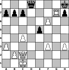 game notation in PGN-format [Event "Wrixum - Open die III."] [Site "www.myChess.de"] [Date "2006.10.24"] [Round "1"] [White "cheldele"] [Black "Andreas"] [ECO "A52"] [WhitemyELO "1500"] [BlackmyELO "1617"] [Result "1-0"] [TimeControl "10/3456000"] [WhiteDays "120"] [BlackDays "105"] [MyChessNo "29477"] 1. d4 Nf6 2. c4 e5 3. dxe5 Ng4 4. e4 Nxe5 5. Nc3 Bb4 6. Bd2 O-O 7. a3 Bxc3 8. Bxc3 Qe7 9. Qc2 d6 10. O-O-O Nbc6 11. f4 Ng6 12. Be2 Nxf4 13. Nf3 Nxe2+ 14. Qxe2 Bg4 15. h3 Bxf3 16. gxf3 f5 17. Rhg1 g6 18. Qc2 Rae8 19. exf5 g5 20. Rde1 Qd8 21. Rxe8 Rxe8 22. f6 Ne5 23. Rxg5+ Kh8 24. Rg7 Ng6 25. Rxg6 Re5 26. Bxe5 dxe5 27. Rg7 1-0 position notation in FEN-format 3q3k/ppp3Rp/5P2/4p3/2P5/P4P1P/1PQ5/2K5 - - - 1 27 Captured white pieces: Captured black pieces: Click on a captured piece in order to display the desired move!