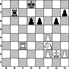 game notation in PGN-format [Event "BdF Chess960 - T960-S03"] [Site "www.myChess.de"] [Date "2006.11.12"] [Round "1"] [White "Knightrider@"] [Black "Lehnhoff@"] [Variant "Fischerrandom"] [SetUp "1"] [FEN "brknnbrq/pppppppp/8/8/8/8/PPPPPPPP/BRKNNBRQ w KQkq - 0 1"] [WhitemyELO "1500"] [BlackmyELO "1500"] [Result "1-0"] [TimeControl "10/2592000"] [WhiteDays "105"] [BlackDays "064"] [MyChessNo "30103"] 1. g3 b5 2. Bg2 Bxg2 3. Qxg2 g6 4. b4 Bg7 5. Bxg7 Qxg7 6. Nd3 Nc6 7. Ne3 f5 8. O-O Nf6 9. c3 Ne4 10. Rb2 O-O 11. Rfb1 e6 12. Nc5 Nxc5 13. bxc5 Qe7 14. d4 a6 15. a4 b4 16. cxb4 Nxd4 17. Nc4 Nc6 18. Qf3 Rbd8 19. Qe3 f4 20. gxf4 Qh4 21. Qg3 Qxf4 22. Qxf4 Rxf4 23. Rc1 Nd4 24. b5 axb5 25. axb5 Kf8 26. e3 Nf3+ 27. Kg2 Ne1+ 28. Kf1 Nd3 29. exf4 Nxc1 30. Ne5 Ke8 31. b6 cxb6 32. cxb6 Rb8 33. b7 Kd8 34. Kg2 Kc7 35. Rc2+ Kd8 36. Rxc1 Rxb7 37. Rc3 d6 38. Nf3 1-0 position notation in FEN-format 3k4/1r5p/3pp1p1/8/5P2/2R2N2/5PKP/8 - - - 1 38 Captured white pieces: ![]() ![]() ![]() ![]() ![]() ![]() ![]() ![]() ![]() ![]() ![]() ![]() ![]() ![]() ![]() Captured black pieces: ![]() ![]() ![]() ![]() ![]() ![]() ![]() ![]() ![]() ![]() ![]() ![]() ![]() ![]() ![]() Click on a captured piece in order to display the desired move!