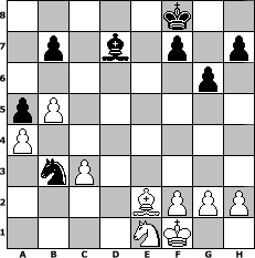 game notation in PGN-format [Event "F"] [Site "www.myChess.de"] [Date "2017.08.16"] [Round "1"] [White "Cuibono"] [Black "jeremyt"] [ECO "C24"] [WhitemyELO "2189"] [BlackmyELO "2142"] [Result "1/2-1/2"] [TimeControl "10/2592000"] [WhiteDays "89"] [BlackDays "54"] [MyChessNo "109195"] 1. e4 e5 2. Bc4 Nf6 3. d3 c6 4. Nf3 Be7 5. O-O d6 6. Re1 Nbd7 7. a4 O-O 8. Nc3 Nc5 9. b4 Ne6 10. Rb1 a5 11. b5 d5 12. exd5 cxd5 13. Bb3 e4 14. dxe4 dxe4 15. Qxd8 Rxd8 16. Nxe4 Nxe4 17. Rxe4 Rd1+ 18. Re1 Rxe1+ 19. Nxe1 Nd4 20. Bc4 Be6 21. Bd3 Rd8 22. Be3 Bb4 23. Rd1 g6 24. Kf1 Rd7 25. Be2 Bc3 26. Bd2 Bxd2 27. Rxd2 Kf8 28. c3 Nb3 29. Rxd7 Bxd7 1/2-1/2 position notation in FEN-format 5k2/1p1b1p1p/6p1/pP6/P7/1nP5/4BPPP/4NK2 - - - 0 30 Captured white pieces: Captured black pieces: Click on a captured piece in order to display the desired move!