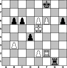game notation in PGN-format [Event "reisinger"] [Site "www.myChess.de"] [Date "2010.08.09"] [Round "1"] [White "reiner"] [Black "espero"] [ECO "A92"] [WhitemyELO "1522"] [BlackmyELO "1624"] [Result "1-0"] [TimeControl "10/1728000"] [WhiteDays "20"] [BlackDays "20"] [MyChessNo "67546"] 1. d4 f5 2. c4 Nf6 3. g3 e6 4. Bg2 Be7 5. Nf3 O-O 6. O-O Ne4 7. Nbd2 d5 8. cxd5 exd5 9. Nxe4 fxe4 10. Ne5 Nd7 11. Qb3 Nxe5 12. dxe5 c6 13. Bxe4 Bh3 14. Bg2 Bxg2 15. Kxg2 Qc7 16. Qe3 b6 17. f4 Bc5 18. Qc3 Qf7 19. h4 Rae8 20. b4 d4 21. Qb3 Qxb3 22. axb3 Bxb4 23. Rxa7 Ra8 24. Rxa8 Rxa8 25. e6 Kf8 26. f5 Be7 27. g4 Ra2 28. Kf3 Bxh4 29. g5 Ra1 30. Kg4 Bf2 31. f6 gxf6 32. Rxf2 Rxc1 33. gxf6 Rg1+ 34. Kf5 h6 35. Ke5 1-0 position notation in FEN-format 5k2/8/1pp1PP1p/4K3/3p4/1P6/4PR2/6r1 - - - 1 35 Captured white pieces: Captured black pieces: Click on a captured piece in order to display the desired move!