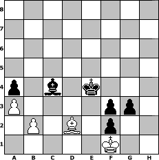 game notation in PGN-format [Event "Entdeckung der Langsamkeit"] [Site "www.myChess.de"] [Date "2009.08.15"] [Round "1"] [White "Andreas"] [Black "sprinterde"] [ECO "B01"] [WhitemyELO "1532"] [BlackmyELO "1623"] [Result "0-1"] [TimeControl "10/3456000"] [WhiteDays "232"] [BlackDays "238"] [MyChessNo "58363"] 1. e4 d5 2. exd5 Qxd5 3. Nc3 Qe5+ 4. Qe2 Qxe2+ 5. Bxe2 Nf6 6. Nf3 Bf5 7. d3 c6 8. Bg5 Nd5 9. Nxd5 cxd5 10. Nd4 Bg6 11. O-O-O Nc6 12. Nb5 Rc8 13. Bg4 e6 14. Bf4 h5 15. Bf3 a6 16. Nd6+ Bxd6 17. Bxd6 Nd4 18. Rd2 Kd7 19. Be5 Nxf3 20. gxf3 f6 21. Bc3 Bf5 22. Rg1 Rh7 23. a3 Ke7 24. Kb1 g6 25. Bb4+ Kf7 26. Ka2 e5 27. Rc1 b6 28. Rdd1 a5 29. Bd2 Kf8 30. c3 Bxd3 31. Be3 Be2 32. Re1 Bxf3 33. Bxb6 a4 34. Ba5 Rd7 35. Bb4+ Kf7 36. Re3 e4 37. Rce1 f5 38. Rg1 d4 39. cxd4 Rxd4 40. Rc3 Rxc3 41. Bxc3 Rd3 42. Re1 Ke6 43. Rg1 Bg4 44. Rc1 Rd1 45. Rxd1 Bxd1 46. Kb1 f4 47. Kc1 Bb3 48. Kd2 g5 49. h3 Kf5 50. f3 exf3 51. Ke1 g4 52. hxg4+ hxg4 53. Kf2 Ke4 54. Bd2 g3+ 55. Kg1 f2+ 56. Kg2 f3+ 57. Kf1 Bc4# 0-1 position notation in FEN-format 8/8/8/8/p1b1k3/P4pp1/1P1B1p2/5K2 - - - 2 58 Captured white pieces: Captured black pieces: Click on a captured piece in order to display the desired move!