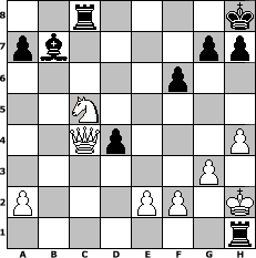 game notation in PGN-format [Event "Hoffnung"] [Site "www.myChess.de"] [Date "2017.03.10"] [Round "1"] [White "Haneken"] [Black "Joschi"] [ECO "C51"] [WhitemyELO "1069"] [BlackmyELO "1579"] [Result "0-1"] [TimeControl "10/1728000"] [WhiteDays "20"] [BlackDays "20"] [MyChessNo "107298"] 1. e4 e5 2. Nf3 Nc6 3. Bc4 Bc5 4. b4 Bxb4 5. c3 Bc5 6. d4 exd4 7. O-O d6 8. cxd4 Bb6 9. d5 Na5 10. Bb2 Ne7 11. Bb5+ c6 12. Ba4 O-O 13. Nh4 Nxd5 14. exd5 Qxh4 15. g3 Qd8 16. dxc6 bxc6 17. Qd3 Bb7 18. Qc3 f6 19. Nd2 d5 20. Bb3 Nxb3 21. Nxb3 Rc8 22. Ba3 Re8 23. h4 d4 24. Qc4+ Kh8 25. Rad1 c5 26. Bxc5 Bxc5 27. Nxc5 Qe7 28. Rfe1 Qxe1+ 29. Rxe1 Rxe1+ 30. Kh2 Rh1# 0-1 position notation in FEN-format 2r4k/pb4pp/5p2/2N5/2Qp3P/6P1/P3PP1K/7r - - - 2 31 Captured white pieces: Captured black pieces: Click on a captured piece in order to display the desired move!