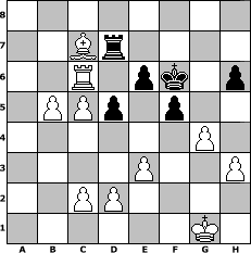 game notation in PGN-format [Event "August 18"] [Site "www.myChess.de"] [Date "2018.08.01"] [Round "1"] [White "borsti"] [Black "hape50"] [ECO "D00"] [WhitemyELO "1287"] [BlackmyELO "1272"] [Result "1-0"] [TimeControl "10/1728000"] [WhiteDays "20"] [BlackDays "20"] [MyChessNo "112770"] 1. d4 d5 2. Bf4 e6 3. Nf3 h6 4. e3 Be7 5. Bd3 Nf6 6. Nc3 a6 7. a3 Nc6 8. O-O b5 9. Ne2 Bb7 10. h3 Nh5 11. Bh2 Na7 12. b3 Qd7 13. Nc3 O-O 14. Ne5 Qe8 15. Qxh5 Nc6 16. Nxc6 Bxc6 17. f4 b4 18. Na4 bxa3 19. Nc5 Bxc5 20. dxc5 f5 21. Qxe8 Rfxe8 22. Rxa3 Bb7 23. Rfa1 Re7 24. Bxa6 Bxa6 25. Rxa6 Rxa6 26. Rxa6 Kf7 27. Rc6 Kf6 28. g4 g6 29. b4 g5 30. b5 gxf4 31. Bxf4 Rd7 32. Bxc7 1-0 position notation in FEN-format 8/2Br4/2R1pk1p/1PPp1p2/6P1/4P2P/2PP4/6K1 - - - 0 32 Captured white pieces: Captured black pieces: Click on a captured piece in order to display the desired move!