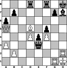 game notation in PGN-format [Event "7. Frankenwaldturnier"] [Site "www.myChess.de"] [Date "2008.07.18"] [Round "2"] [White "UPS"] [Black "werderfan"] [ECO "B13"] [WhitemyELO "1631"] [BlackmyELO "1545"] [Result "1/2-1/2"] [TimeControl "10/864000"] [WhiteDays "22"] [BlackDays "40"] [MyChessNo "46443"] 1. e4 c6 2. d4 d5 3. exd5 cxd5 4. Nc3 Nf6 5. Nf3 Bg4 6. Be2 e6 7. O-O Bb4 8. Bd2 O-O 9. h3 Bh5 10. a3 Bd6 11. Bg5 h6 12. Bh4 Nbd7 13. Qd2 a6 14. g4 Bg6 15. g5 hxg5 16. Bxg5 Qc7 17. Nh4 Ne4 18. Nxe4 Bxe4 19. f3 Bh7 20. c3 f6 21. Be3 Bh2+ 22. Kh1 Qg3 23. Rf2 Qxh4 24. Rxh2 e5 25. Rg1 e4 26. Bf2 Qh5 27. f4 Qh6 28. Be3 f5 29. c4 Nf6 30. cxd5 Nxd5 31. Bc4 Rad8 32. Qa5 Qc6 33. Rc1 Qe6 34. Rg2 Kh8 35. Rcg1 Qh6 36. Bxd5 Qxh3+ 37. Rh2 Qxe3 1/2-1/2 position notation in FEN-format 3r1r1k/1p4pb/p7/Q2B1p2/3PpP2/P3q3/1P5R/6RK - - - 0 38 Captured white pieces: Captured black pieces: Click on a captured piece in order to display the desired move!