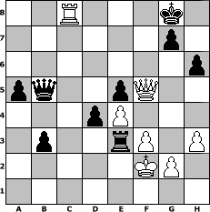 game notation in PGN-format [Event "11. Wikinger-Klubmeisterschaft"] [Site "www.myChess.de"] [Date "2015.03.29"] [Round "2"] [White "MiFie"] [Black "Master1"] [ECO "A46"] [WhitemyELO "1093"] [BlackmyELO "1327"] [Result "1-0"] [TimeControl "10/2592000"] [WhiteDays "29"] [BlackDays "30"] [MyChessNo "98685"] 1. d4 Nf6 2. Nf3 d5 3. Bg5 e6 4. e3 Be7 5. Bd3 Nc6 6. O-O O-O 7. h3 Nd7 8. Bf4 Nb4 9. c3 Nxd3 10. Qxd3 c6 11. Nbd2 c5 12. a3 c4 13. Qc2 b6 14. b3 Ba6 15. Ne5 Nxe5 16. Bxe5 Rb8 17. Bxb8 Qxb8 18. Nf3 cxb3 19. Qxb3 Bxf1 20. Kxf1 h6 21. Ne5 Qb7 22. Qb5 a6 23. Qb3 b5 24. Nd3 a5 25. a4 b4 26. Nc5 Bxc5 27. dxc5 Rc8 28. f3 Rxc5 29. e4 Rxc3 30. Qb2 d4 31. Rd1 e5 32. Qa2 Ra3 33. Qc4 Rxa4 34. Rc1 Kh7 35. Qb3 Qb5+ 36. Ke1 Ra3 37. Qxf7 Re3+ 38. Kf2 b3 39. Qf5+ Kh8 40. Qf8+ Kh7 41. Qf5+ Kg8 42. Rc8+ 1-0 position notation in FEN-format 2R3k1/6p1/7p/pq2pQ2/3pP3/1p2rP1P/5KP1/8 - - - 7 42 Captured white pieces: Captured black pieces: Click on a captured piece in order to display the desired move!