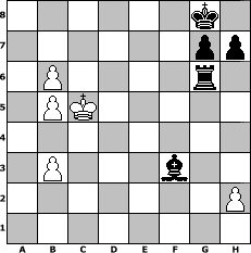 game notation in PGN-format [Event "Eine Chance f"] [Site "www.myChess.de"] [Date "2008.08.01"] [Round "1"] [White "rux"] [Black "bluescreenlover"] [ECO "A21"] [WhitemyELO "1424"] [BlackmyELO "1226"] [Result "0-1"] [TimeControl "10/1728000"] [WhiteDays "20"] [BlackDays "20"] [MyChessNo "46735"] 1. c4 e5 2. Nc3 Bc5 3. Ne4 d6 4. Nf3 Bf5 5. Nxc5 dxc5 6. Nxe5 Qd4 7. Qa4+ Nd7 8. Nf3 Qf6 9. d4 cxd4 10. Bg5 Qb6 11. Qb5 Ngf6 12. Ne5 Qxb5 13. cxb5 Nxe5 14. f3 Ned7 15. e4 Nxe4 16. Bf4 Nef6 17. Bxc7 O-O 18. Rd1 Rfe8+ 19. Kf2 b6 20. Bc4 Rac8 21. Rc1 Rxc7 22. Bxf7+ Kxf7 23. Rxc7 d3 24. Rd1 Kg8 25. Rd2 Be4 26. Rxa7 Nc5 27. Kg1 Bd5 28. Kf2 Bc4 29. a4 Nfe4+ 30. fxe4 Nxe4+ 31. Ke1 Nxd2+ 32. Kxd2 Re2+ 33. Kc3 Rc2+ 34. Kb4 d2 35. Rd7 Be2 36. b3 d1=Q 37. Rxd1 Bxd1 38. a5 Rxg2 39. axb6 Bf3 40. Kc5 Rg6 0-1 position notation in FEN-format 6k1/6pp/1P4r1/1PK5/8/1P3b2/7P/8 - - - 3 41 Captured white pieces: ![]() ![]() ![]() ![]() ![]() ![]() ![]() ![]() ![]() ![]() ![]() ![]() ![]() ![]() ![]() Captured black pieces: ![]() ![]() ![]() ![]() ![]() ![]() ![]() ![]() ![]() ![]() ![]() ![]() ![]() ![]() ![]() Click on a captured piece in order to display the desired move!