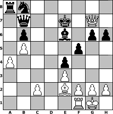 game notation in PGN-format [Event "YOUR LAST BREATH"] [Site "www.myChess.de"] [Date "2019.11.17"] [Round "2"] [White "martinus"] [Black "iamnothere"] [ECO "A10"] [WhitemyELO "1718"] [BlackmyELO "1432"] [Result "1-0"] [TimeControl "10/3456000"] [WhiteDays "40"] [BlackDays "38"] [MyChessNo "116374"] 1. c4 f5 2. d4 Nf6 3. Nc3 e6 4. Nf3 g6 5. Bg5 Be7 6. e3 h6 7. Bxf6 Bxf6 8. Be2 b6 9. O-O Bb7 10. b4 c5 11. Nb5 d6 12. Qa4 Bc6 13. Rad1 a6 14. d5 axb5 15. Qb3 Bd7 16. cxb5 e5 17. a4 e4 18. Nd2 O-O 19. Nc4 cxb4 20. Nxd6 Be7 21. Nb7 Qc8 22. d6+ Be6 23. Qxb4 Qxb7 24. dxe7 Re8 25. Rd8 Kf7 26. Rxe8 Kxe8 27. Qd4 Kxe7 28. Qg7+ 1-0 position notation in FEN-format rn6/1q2k1Q1/1p2b1pp/1P3p2/P3p3/4P3/2P1BPPP/5RK1 - - - 1 28 Captured white pieces: Captured black pieces: Click on a captured piece in order to display the desired move!