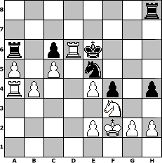 game notation in PGN-format [Event "Schach am laufenden Band"] [Site "www.myChess.de"] [Date "2017.10.17"] [Round "1"] [White "sprinterde"] [Black "Rabenvogel"] [ECO "C30"] [WhitemyELO "1707"] [BlackmyELO "1548"] [Result "1-0"] [TimeControl "10/1728000"] [WhiteDays "20"] [BlackDays "20"] [MyChessNo "109985"] 1. e4 e5 2. f4 d6 3. Nf3 Bg4 4. fxe5 dxe5 5. Bc4 Bxf3 6. Qxf3 Qf6 7. Qg4 Nh6 8. Qc8+ Qd8 9. Qxb7 Nd7 10. Bb5 Rb8 11. Bxd7+ Kxd7 12. Qxa7 Qh4+ 13. Kf1 Qf4+ 14. Qf2 Qxf2+ 15. Kxf2 Bc5+ 16. Kf3 g5 17. d3 Rhf8 18. Bxg5 Ng8 19. b3 f6 20. Be3 Bxe3 21. Kxe3 Ne7 22. Nd2 f5 23. Rhf1 f4+ 24. Kf2 h5 25. Nf3 Ng6 26. a4 h4 27. a5 Ra8 28. Ra4 Rf6 29. b4 Rfa6 30. c4 c6 31. Rfa1 Rb8 32. Rd1 Kd6 33. d4 Rh8 34. dxe5+ Ke6 35. c5 Nxe5 36. Rd6+ 1-0 position notation in FEN-format 7r/8/r1pRk3/P1P1n3/RP2Pp1p/5N2/4PKPP/8 - - - 1 36 Captured white pieces: Captured black pieces: Click on a captured piece in order to display the desired move!