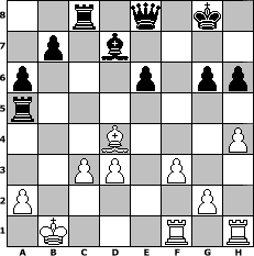 game notation in PGN-format [Event "Hitzeschlacht"] [Site "www.myChess.de"] [Date "2009.08.13"] [Round "1"] [White "Knight"] [Black "reisender"] [ECO "A40"] [WhitemyELO "1179"] [BlackmyELO "1342"] [Result "0-1"] [TimeControl "10/864000"] [WhiteDays "10"] [BlackDays "10"] [MyChessNo "58251"] 1. d4 g6 2. Nc3 Bg7 3. e4 e6 4. f3 Nc6 5. Be3 a6 6. Bd3 Nf6 7. Qd2 d5 8. e5 Nd7 9. O-O-O f6 10. exf6 Nxf6 11. Kb1 Bd7 12. Bg5 Nxd4 13. Nge2 Nxe2 14. Qxe2 O-O 15. h4 Qe8 16. Rdf1 h6 17. Be3 Nh5 18. Bf2 Bxc3 19. bxc3 Nf4 20. Qe5 Nxd3 21. cxd3 Rf5 22. Qxc7 Rc8 23. Qa5 d4 24. Bxd4 Rxa5 0-1 position notation in FEN-format 2r1q1k1/1p1b4/p3p1pp/r7/3B3P/2PP1P2/P5P1/1K3R1R - - - 0 25 Captured white pieces: Captured black pieces: Click on a captured piece in order to display the desired move!