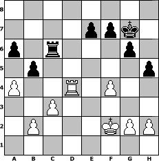 game notation in PGN-format [Event "Aufs neue Jahr!!!"] [Site "www.myChess.de"] [Date "2016.01.06"] [Round "1"] [White "Andylein1989"] [Black "atlantis"] [ECO "B52"] [WhitemyELO "1507"] [BlackmyELO "1581"] [Result "1/2-1/2"] [TimeControl "10/2592000"] [WhiteDays "105"] [BlackDays "060"] [MyChessNo "102034"] 1. e4 c5 2. Nf3 d6 3. Bb5+ Bd7 4. Nc3 a6 5. Bxd7+ Nxd7 6. O-O Ngf6 7. d4 cxd4 8. Nxd4 g6 9. Be3 Bg7 10. Nf3 O-O 11. Re1 Ng4 12. Bd4 Nge5 13. Nxe5 Nxe5 14. Ne2 Qc7 15. c3 Rfd8 16. Qc2 d5 17. f4 Nc6 18. Rad1 dxe4 19. Bxg7 Kxg7 20. Qxe4 Rd7 21. Rxd7 Qxd7 22. Nd4 Nxd4 23. Rd1 Nf3+ 24. Qxf3 Qb5 25. Rd2 Rc8 26. Qd3 Qxd3 27. Rxd3 b5 28. Kf2 h5 29. Rd4 Rc6 30. a4 1/2-1/2 position notation in FEN-format 8/4ppk1/p1r3p1/1p5p/P2R1P2/2P5/1P3KPP/8 - - - 0 30 Captured white pieces: Captured black pieces: Click on a captured piece in order to display the desired move!