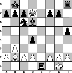 game notation in PGN-format [Event "Tigran (Wartanowitsch)Petrosjan Turnier"] [Site "www.myChess.de"] [Date "2009.08.09"] [Round "1"] [White "Hobbykegler"] [Black "Knight"] [ECO "A20"] [WhitemyELO "1093"] [BlackmyELO "1179"] [Result "0-1"] [TimeControl "10/2592000"] [WhiteDays "55"] [BlackDays "60"] [MyChessNo "58140"] 1. c4 e5 2. b3 Nf6 3. Bb2 d5 4. e3 Nc6 5. Nc3 d4 6. exd4 exd4 7. Nd5 Nxd5 8. cxd5 Qxd5 9. Rc1 Bd6 10. Qe2+ Be6 11. Nh3 O-O-O 12. Qd3 Bxh3 13. Qxh3+ Kb8 14. Bc4 Qe5+ 15. Be2 Rde8 16. O-O h5 17. Qd7 Qxe2 18. Rfe1 Qxe1+ 19. Rxe1 Rxe1# 0-1 position notation in FEN-format 1k5r/pppQ1pp1/2nb4/7p/3p4/1P6/PBPP1PPP/4r1K1 - - - 0 20 Captured white pieces: Captured black pieces: Click on a captured piece in order to display the desired move!