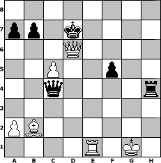 game notation in PGN-format [Event "R"] [Site "www.myChess.de"] [Date "2009.01.29"] [Round "1"] [White "Ostseeboy"] [Black "beowulf"] [ECO "D10"] [WhitemyELO "1306"] [BlackmyELO "1449"] [Result "1-0"] [TimeControl "10/864000"] [WhiteDays "38"] [BlackDays "40"] [MyChessNo "52158"] 1. d4 d5 2. c4 c6 3. c5 Nf6 4. e3 g6 5. Nf3 Bg7 6. Be2 O-O 7. O-O Bg4 8. Nc3 Nbd7 9. Bd2 Re8 10. Qb3 Qc7 11. g3 Ne4 12. Bc1 Ndf6 13. Re1 Nxc3 14. bxc3 Ne4 15. Nh4 Bxe2 16. Rxe2 e5 17. dxe5 Bxe5 18. Bb2 f5 19. f3 Ng5 20. f4 Nh3+ 21. Kg2 Nxf4+ 22. exf4 Bxf4 23. Rxe8+ Rxe8 24. c4 Re2+ 25. Kf1 Rxh2 26. cxd5 cxd5 27. Qxd5+ Qf7 28. Qd8+ Qf8 29. Qd4 Bxg3 30. Qh8+ Kf7 31. Qxh7+ Ke8 32. Qxg6+ Qf7 33. Qxg3 Qc4+ 34. Kg1 Rxh4 35. Re1+ Kd7 36. Qd6+ 1-0 position notation in FEN-format 8/pp1k4/3Q4/2P2p2/2q4r/8/PB6/4R1K1 - - - 3 36 Captured white pieces: Captured black pieces: Click on a captured piece in order to display the desired move!