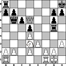 game notation in PGN-format [Event "Abtausch Variante"] [Site "www.myChess.de"] [Date "2007.02.05"] [Round "1"] [White "Andylein1989"] [Black "Mike"] [ECO "D35"] [WhitemyELO "1459"] [BlackmyELO "1453"] [Result "1-0"] [TimeControl "10/1728000"] [WhiteDays "58"] [BlackDays "30"] [MyChessNo "32318"] 1. d4 d5 2. c4 e6 3. Nc3 Nf6 4. cxd5 exd5 5. Bf4 c6 6. e3 Be7 7. Bd3 O-O 8. Nf3 Nbd7 9. O-O Re8 10. Ne5 Nf8 11. h3 Ng6 12. Nxg6 fxg6 13. Qf3 Rf8 14. Qg3 Nh5 15. Qf3 Bd6 16. Ne2 Nxf4 17. Nxf4 Bf5 18. Bxf5 Rxf5 19. Qg4 Rg5 20. Qe6+ Kh8 21. Nd3 Qb6 22. Qxd6 1-0 position notation in FEN-format r6k/pp4pp/1qpQ2p1/3p2r1/3P4/3NP2P/PP1P1PP1/R4RK1 - - - 0 22 Captured white pieces: Captured black pieces: Click on a captured piece in order to display the desired move!