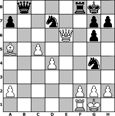 game notation in PGN-format [Event "Schachturnier Eins"] [Site "www.myChess.de"] [Date "2015.11.01"] [Round "1"] [White "Steffi"] [Black "FrankB"] [ECO "D10"] [WhitemyELO "1517"] [BlackmyELO "1677"] [Result "1-0"] [TimeControl "10/1728000"] [WhiteDays "16"] [BlackDays "18"] [MyChessNo "101065"] 1. d4 d5 2. c4 c6 3. e3 Nf6 4. Nc3 Bf5 5. Nf3 Nbd7 6. Be2 e6 7. O-O Bd6 8. c5 Bc7 9. b4 O-O 10. Nh4 Bg6 11. Nxg6 fxg6 12. b5 e5 13. bxc6 bxc6 14. Rb1 Ba5 15. Bd2 Rb8 16. Qa4 exd4 17. exd4 Qc7 18. Nxd5 Nxd5 19. Bxa5 Qc8 20. Bg4 N5f6 21. Rxb8 Qxb8 22. Qxc6 Nxg4 23. Qe6+ 1-0 position notation in FEN-format 1q3rk1/p2n2pp/4Q1p1/B1P5/3P2n1/8/P4PPP/5RK1 - - - 1 23 Captured white pieces: Captured black pieces: Click on a captured piece in order to display the desired move!