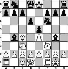 game notation in PGN-format [Event "1. Haithabu-Spiele"] [Site "www.myChess.de"] [Date "2008.08.15"] [Round "1"] [Board "3"] [White "Nightflight"] [Black "werderfan"] [ECO "C42"] [WhitemyELO "1628"] [BlackmyELO "1578"] [Result "0-1"] [TimeControl "10/2592000"] [WhiteDays "00"] [BlackDays "30"] [MyChessNo "47178"] 1. e4 e5 2. Nf3 Nf6 3. Nc3 Bb4 4. Bc4 d6 5. O-O Bg4 0-1 position notation in FEN-format rn1qk2r/ppp2ppp/3p1n2/4p3/1bB1P1b1/2N2N2/PPPPPPPP/R1BQ1RK1 - kq - 2 6 Captured white pieces: Captured black pieces: Click on a captured piece in order to display the desired move!